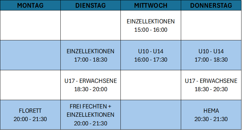 Der Akademische Fechtclub Bern bietet täglich Gruppentrainings für verschiedene Altersklassen in den Disziplinen Degen, Florett und HEMA an.